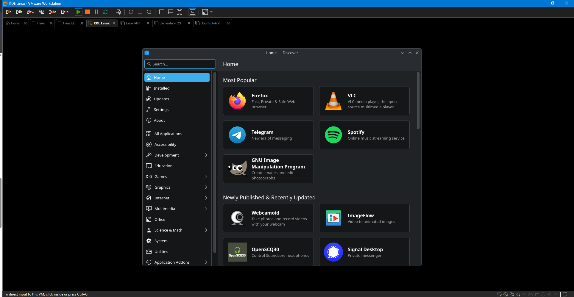 In this build KDE silently crashes and reloads one or more times immediately after login. If it does this more than three times, it stops reloading and I get a black screen with the Discover window.