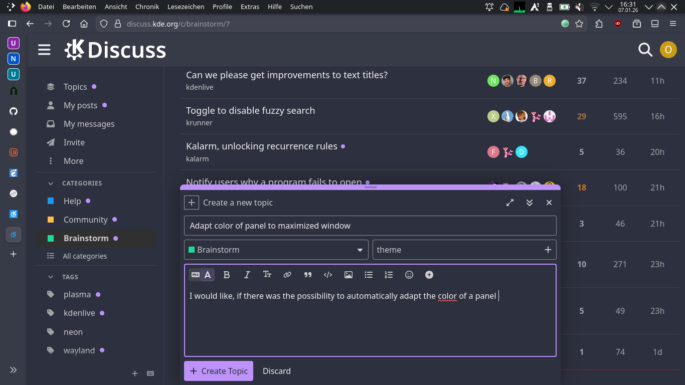 I would like, if there was the possibility to automatically adapt the colour of a panel to a maximised window. In my case, Firefox adapts it colours to the current website using an extension ( Adaptive Tab Bar Color – Get this Extension for 🦊 Firefox (en-US) ) and I think it’s a loss of unity, if the panel has another colour.