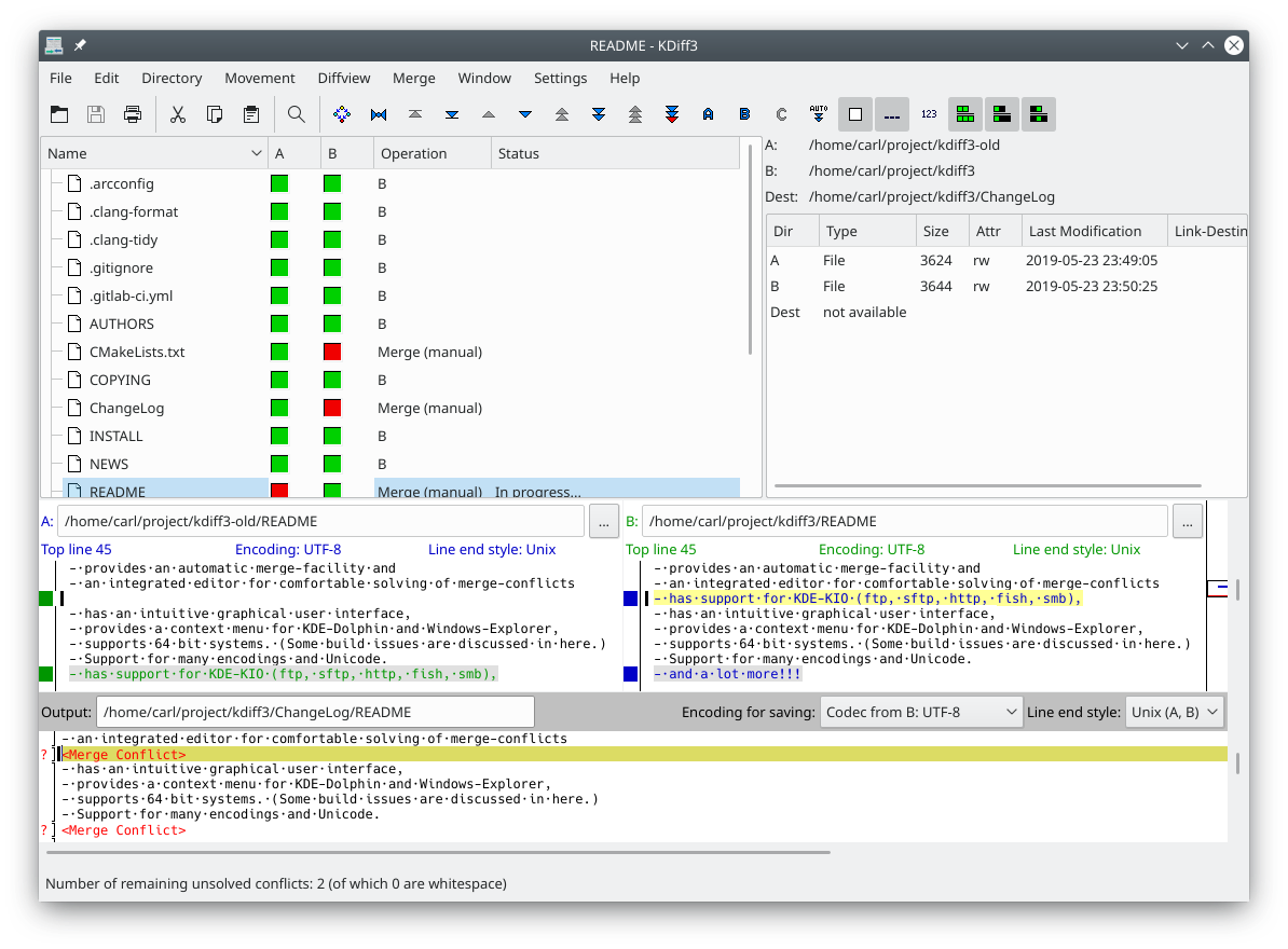 KDiff3 — a tool for comparing up to 3 files, merge them, create a patch, etc