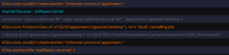 If I try to use the application launcher to search for apps and install them, it comes up with an error “Unable to create KIO worker. Unknown protocol ‘appstream’.” I get this to happen repeatedly even with fresh installs. the exact test case ive been using is: open the application launcher, search for “gparted”, click get or install button, error shows up afterward.
