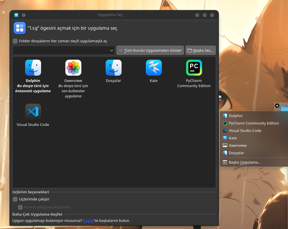 KDE’de bir klasörü “Birlikte Aç” ile açarken, eğer uygulamayı “her zaman seçili uygulamayla aç” seçeneğini işaretlemezsem, uygulama “Birlikte Aç” listesine eklenmiyor. Ayrıca eklenen uygulamalar listeden kaldırılamıyor. Bence, bu kısma (görseldeki yere) uygulama ekleme ve kaldırmayı daha kolay hâle getirecek bir iyileştirme eklenebilir.