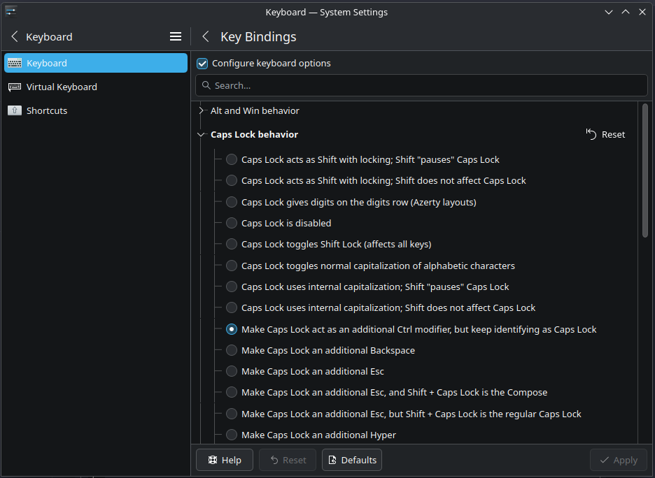 I’ve been typing things with Caps Lock for close to 20 years ; bit too late to change the habit. I’d rather put in the bit of work required to make it work under Linux rather than relearn a huge chunk of my typing habits.