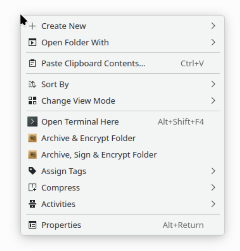 I think the confusion around this whole issue is that the gpg servicemenu files (I guess they came with fedora 42) produce a right click menu (e.g. in an empty folder) where there is no “actions” menu, yet the kleopatra ones (that came with fedora 43) add both “archive + encrypt folder” and “archive, sign + encrypt folder” to the right click menu, thus pushing the extra actions on the top level menu into the “actions” folder