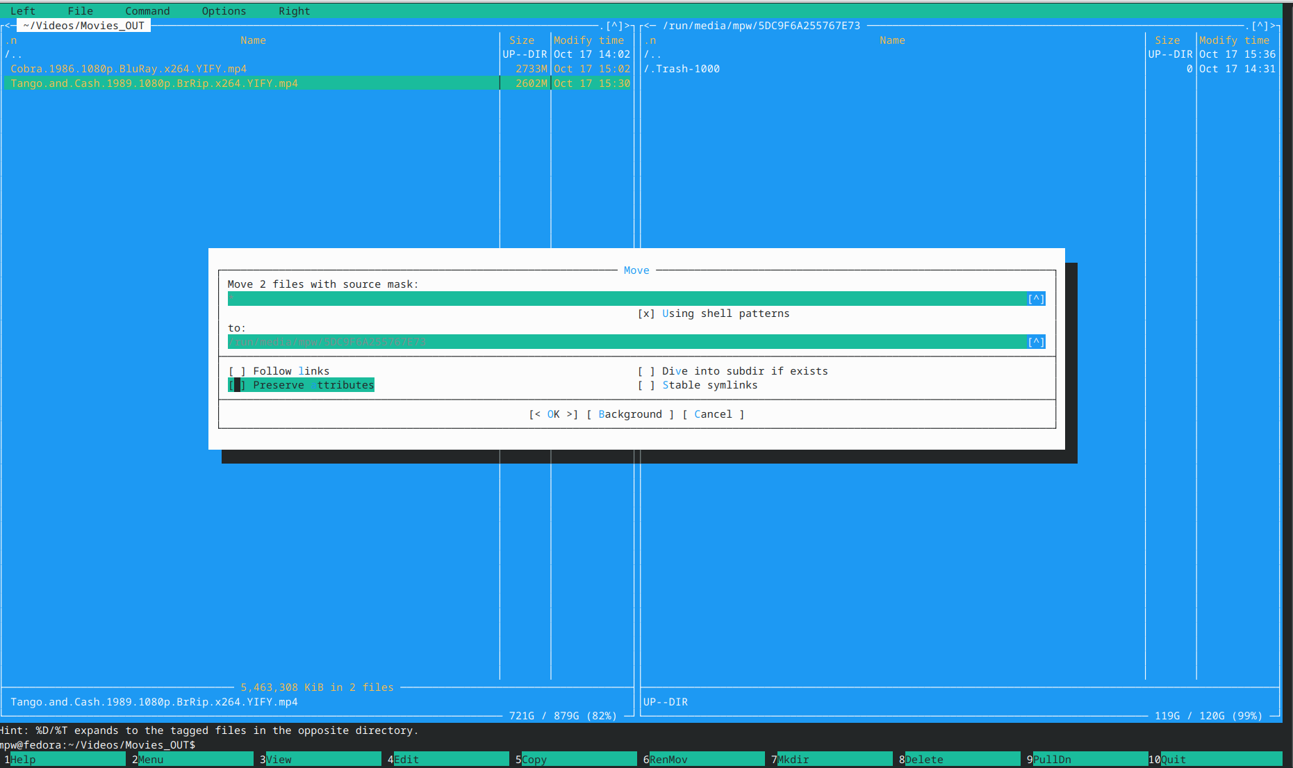 I’m trying to move all of the files from ~/Videos/Movies_OUT which is ext4 to the mounted USB (Which is NTFS I think, can’t remember.. “Microsoft Basic Data”).