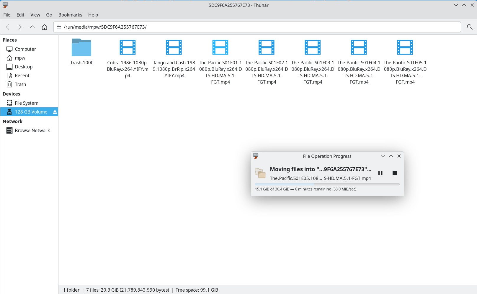 I have installed Thunar and can confirm that my workflow works with Thunars; after my bash script finishes and I have a folder (~/Videos/Movies_OUT) filled with movies, I can simply go into that folder and use Ctrl+A to select everything, use Ctrl+X to Cut them and then I click on the USB drive (NTFS filesystem) in Thunar’s left-hand menu (Just as I do in Dolphin):