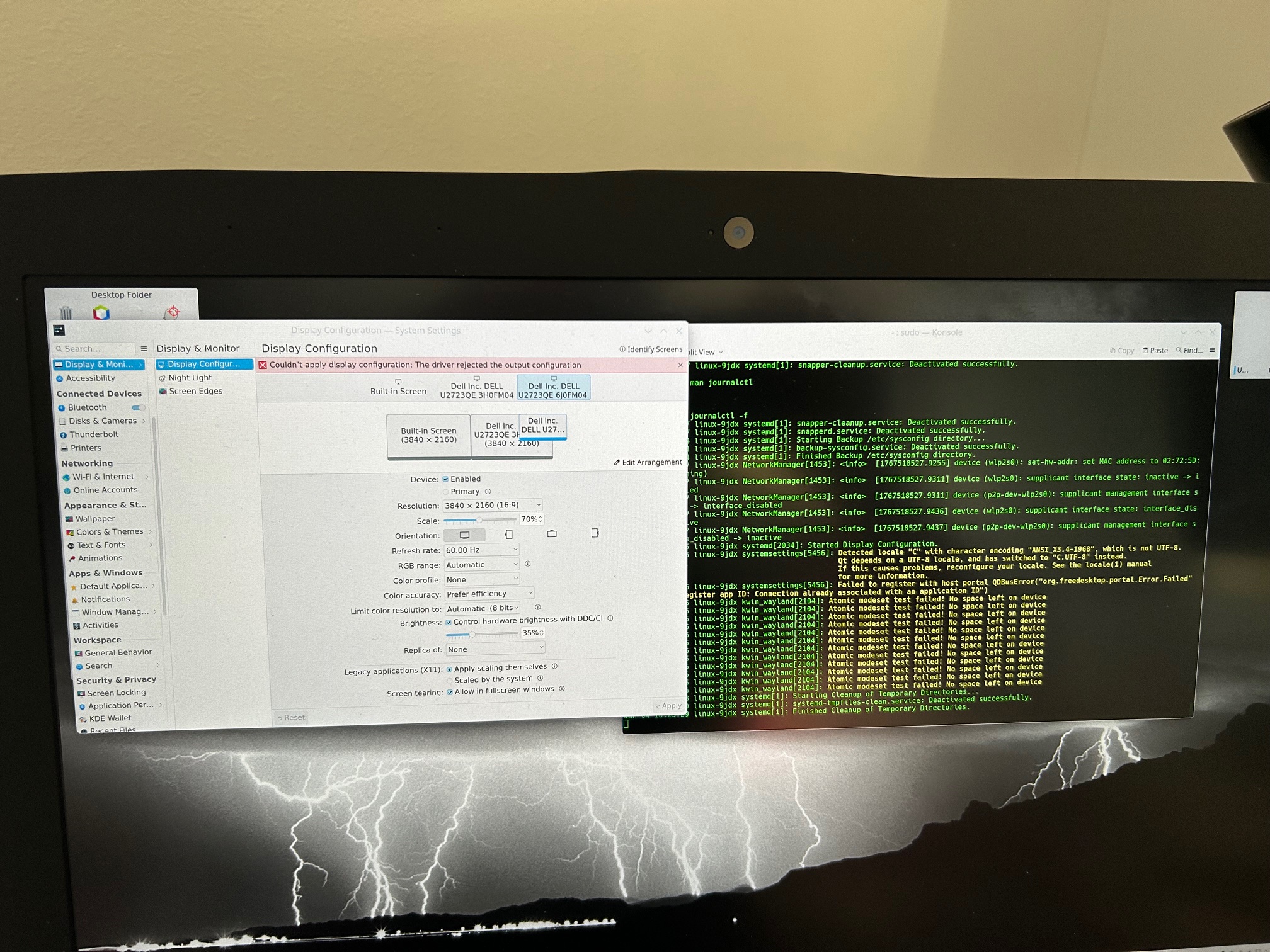 Jan 04 10:22:45 linux-9jdx kwin_wayland[2104]: Atomic modeset test failed! No space left on device