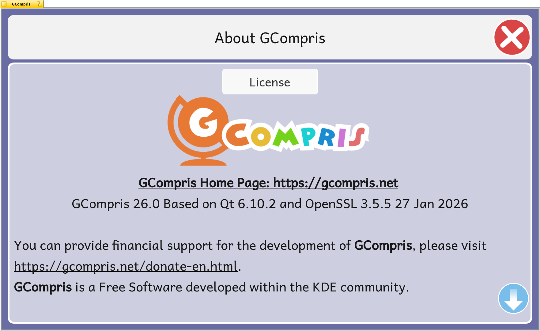 The collection comes with 197 activities, including 2 new ones: “Drawing wheels”, an activity for drawing with a gear rotating in a cogwheel; and “Multiple choice questions”, an activity that can be enabled through GCompris-teachers (see below).