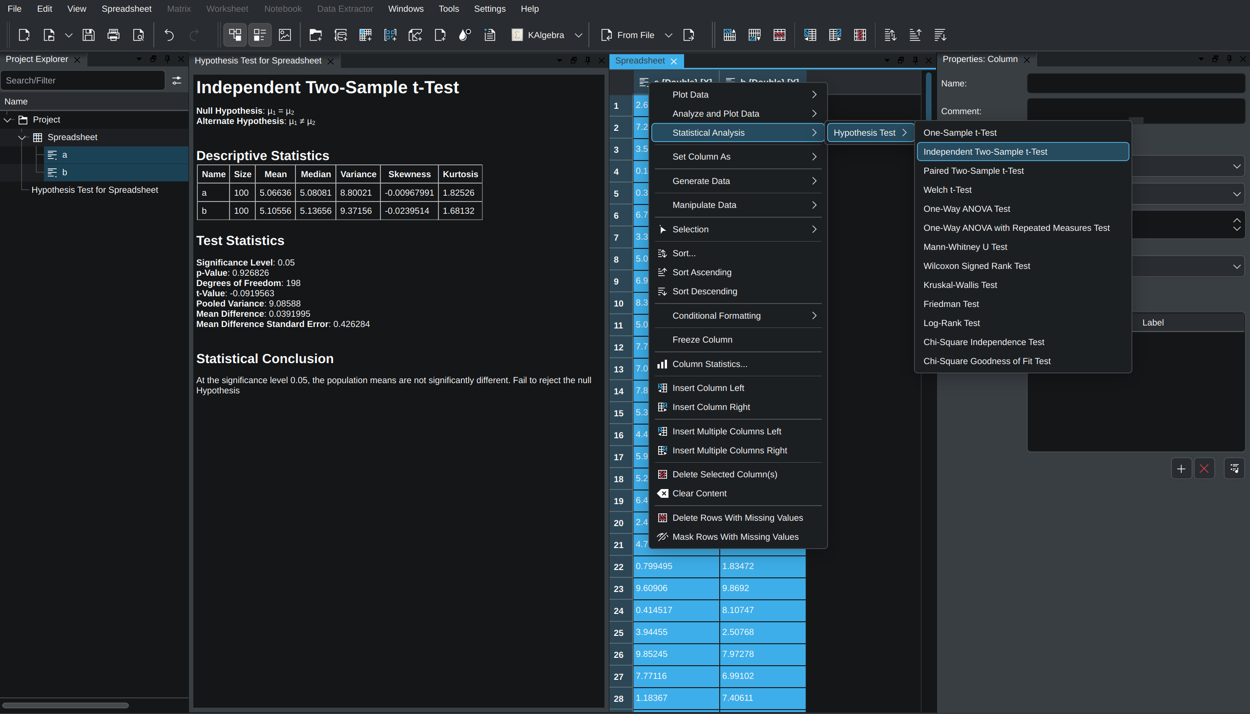 For context, I’m trying to do hypothesis testing on sets of data and later on found out that LabPlot is not able to do this natively without python. As of now I’m flattening and copying the data with comma separators into a variable in python, but this will get increasingly problematic with large datasets