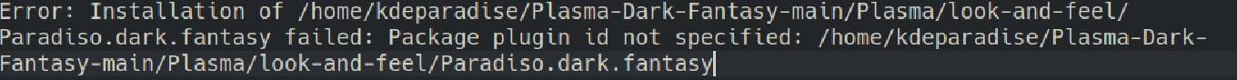 I tried to make my own global theme using the plasma-sdk package. On my main system (Solus 4.7, Plasmashell 6.4.3), it only shows up in the Plasma global theme explorer and can’t be applied through system settings, despite it being in ~/.local/share/plasma/look-and-feel. I then tried to install in a VM using KDE Neon user edition and Plasmashell 6.4.3, which resulted in this error.
