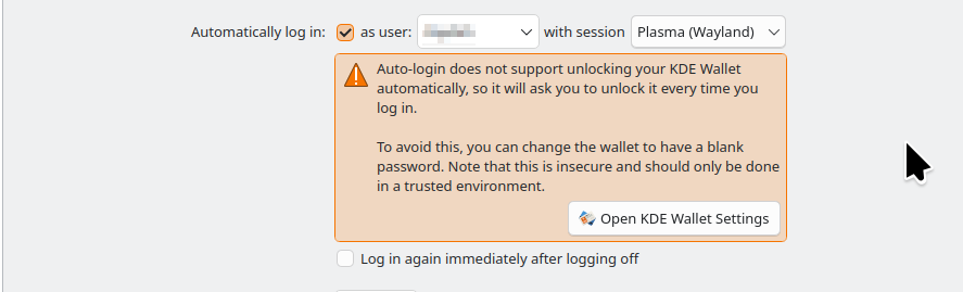 However, when setting SDDM to autologin, this does disable the automatic opening of kwallet, which stores things like your WiFi password, among other things. You get a message to this effect when setting autologin in KDE’s System Settings. If you set this using a different desktop environment, you would not see this.