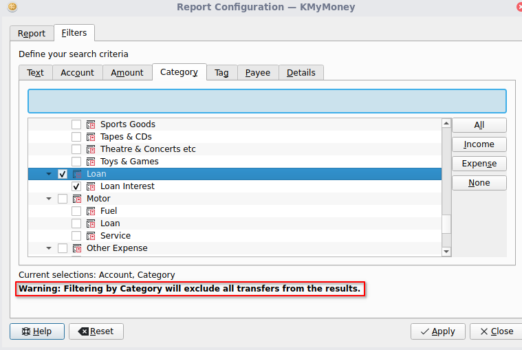 in real-life data, there are much more transactions and the Income and Expenses By Year report shows much more categories than in my simple example here. Therefore i must filter on category to get a usable report.