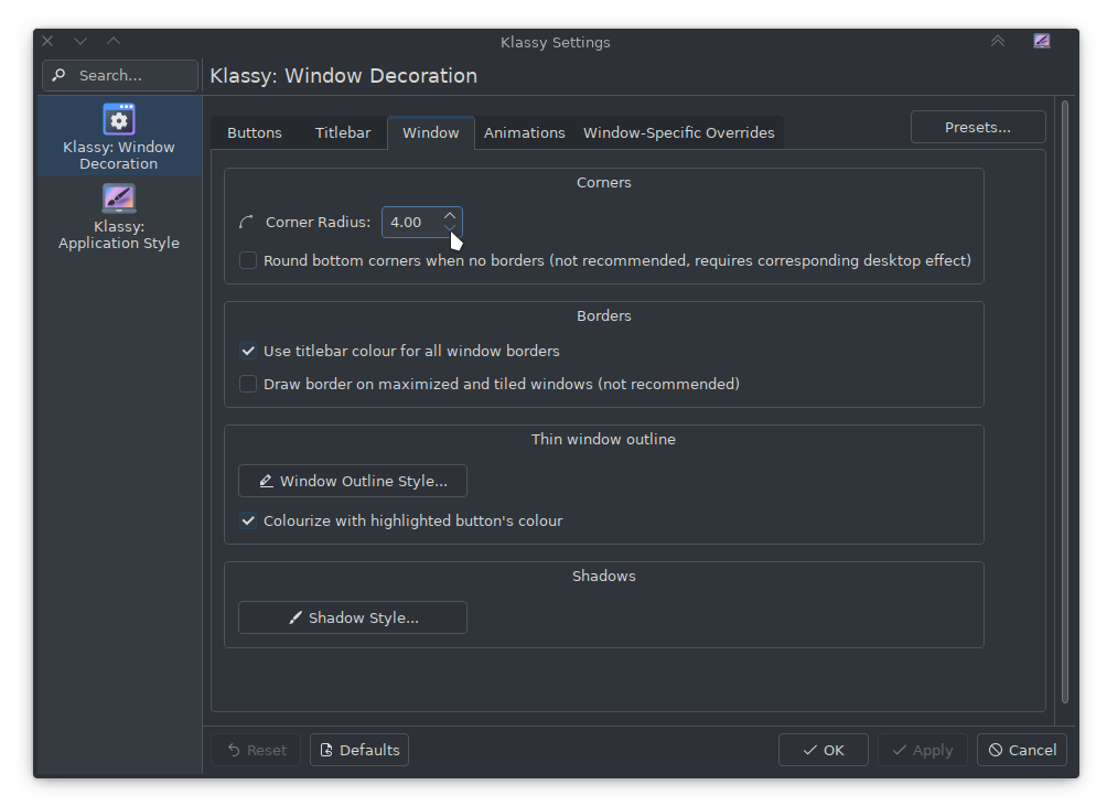 I experimented also with the shadows in Klassy - you can experiment making them into a ‘glow’ for the active window (a little like Oxygen) which works nicely for some dark themes.