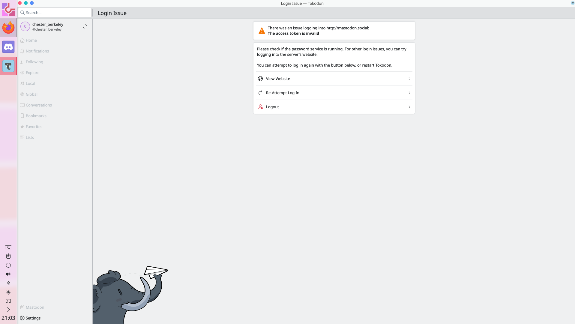 I had been using Tokodon for a few days, but suddenly this “invalid token” error appeared, which prevents me from accessing my Mastodon account.