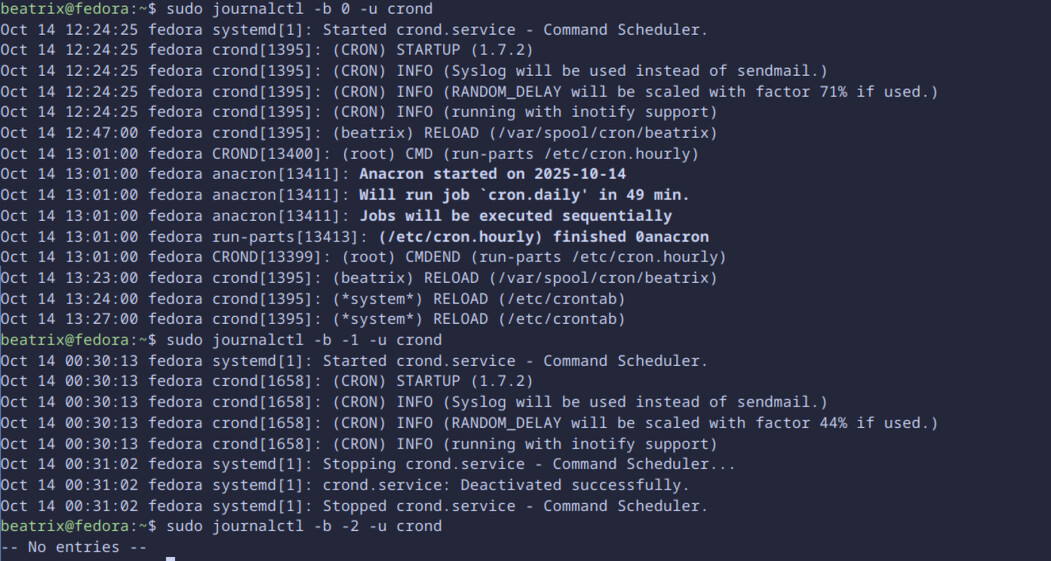 I think the previous boot is not very helpful here because I had restarted my computer to complete updates before shutting it down, so uptime was only about a minute. As for the boot before that boot, it should have shut down at 12AM and didn’t, but we don’t have logs for that.