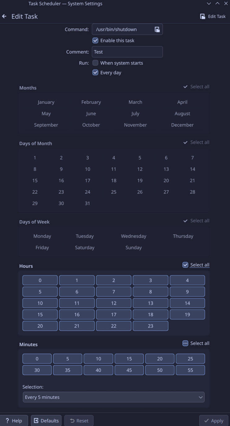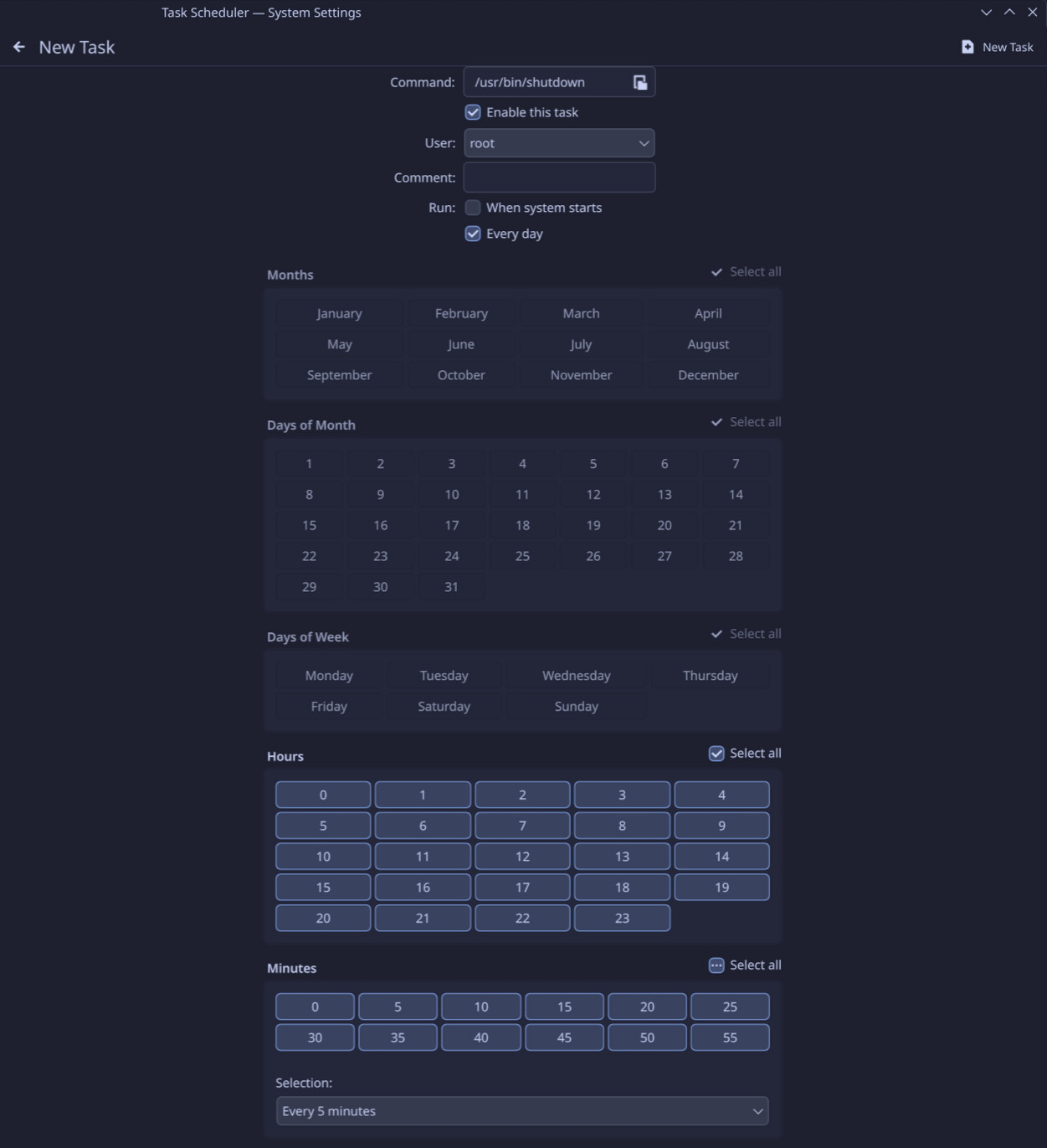 Hi, I’m trying to use Kcron, a.k.a. KDE Task Scheduler for automated, scheduled shutdowns on Fedora 42 Plasma Desktop. I’ve seemingly configured everything correctly, but it just won’t run the commands at the scheduled times. I need help getting it to work, or recommendations for an alternative GUI that can do regularly scheduled shutdowns.