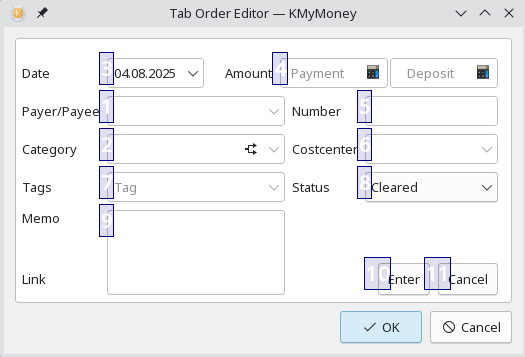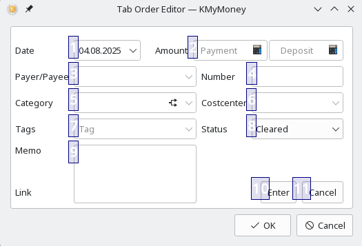 There is feature called TabOrderEditor to rearrange the way the focus takes when pressing TAB. To open it, press Alt-Ctrl-T (from 5.2.1 on this will be Alt+Meta-T by default because on KF6 Alt-Ctrl-T opens a terminal).