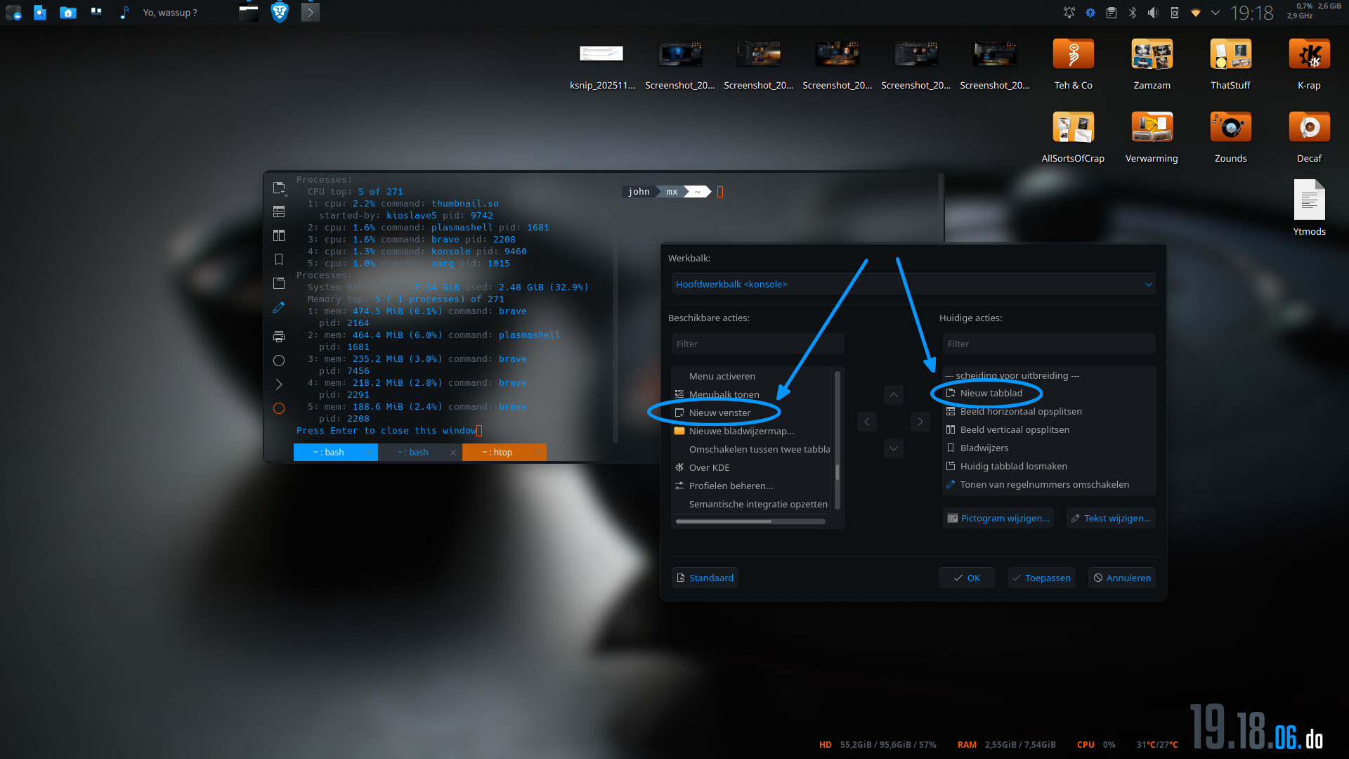 Sorry I don’t use correct names because I use a German setup with KDE. But I didn’t manage to get a “sub windows” in konsole (a tab in konsole). On control panel with right mouse click of konsole there is an option like new sub tab in konsole but only a new konsole starts.