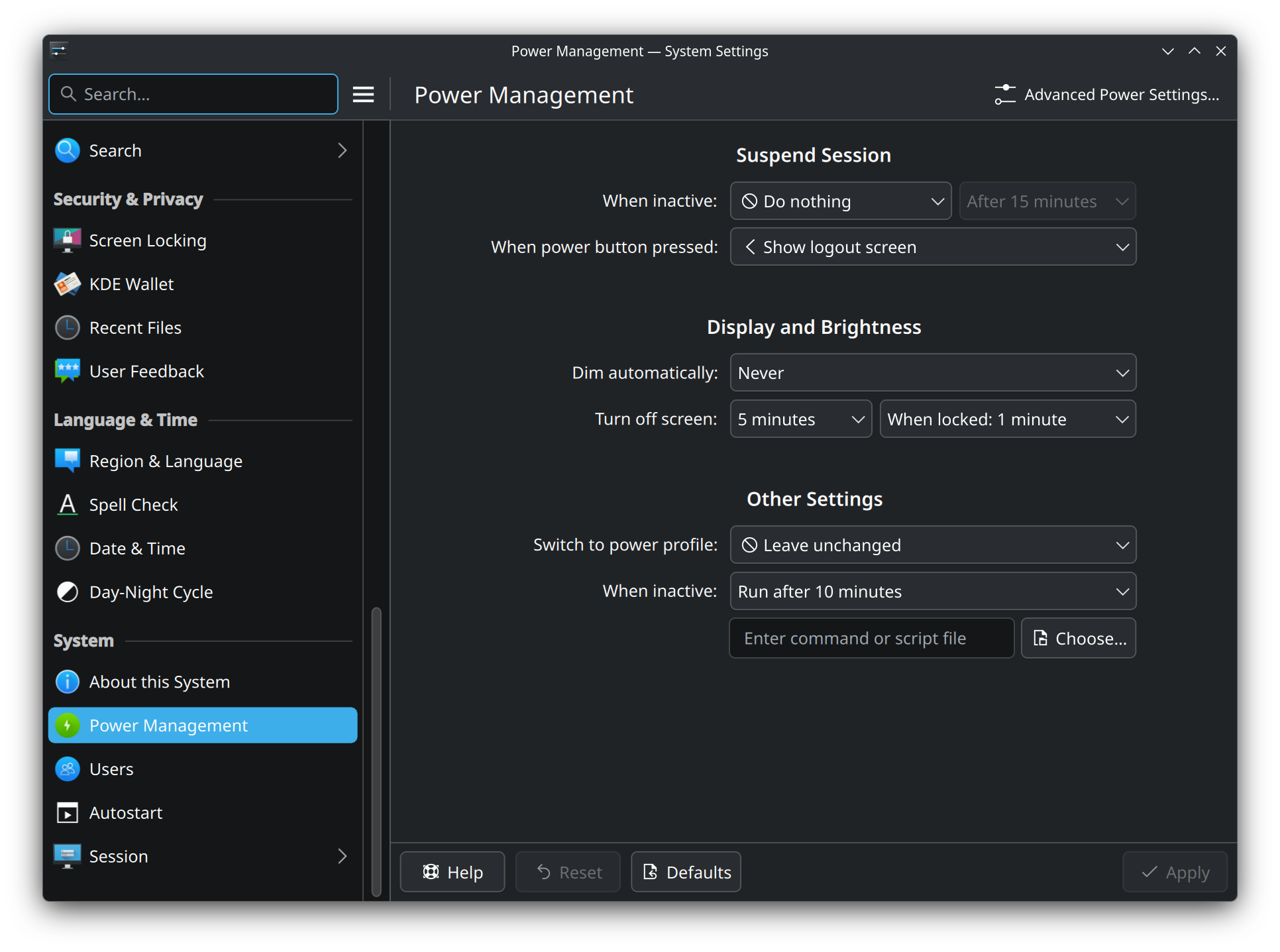 My computer is nuc11 which is powered by AC adapter. I run fedora 43 and plasma desktop 6.5.1. The session is X11. It is configured with lock screen automatically after 1 minute and turn off screen 5 minute (when locked 1 minute), as the following screenshots. To my understanding, the desktop is locked after 1 minute, and then the screen is turned off after another 1 minute. But when it locks screen automatically, it turns off the screen at the same time.