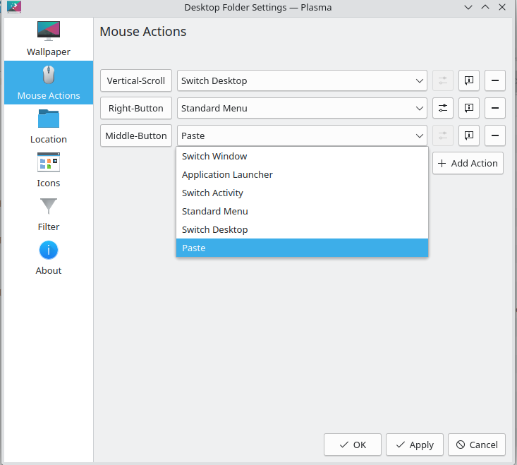 I feel it is strange that Middle Button Paste appears under “Workspace → General Behavior” and does not appear under “Mouse”. It’s just not a place that I would expect to find a middle click paste setting. I think it would be helpful if the setting appeared in both places.