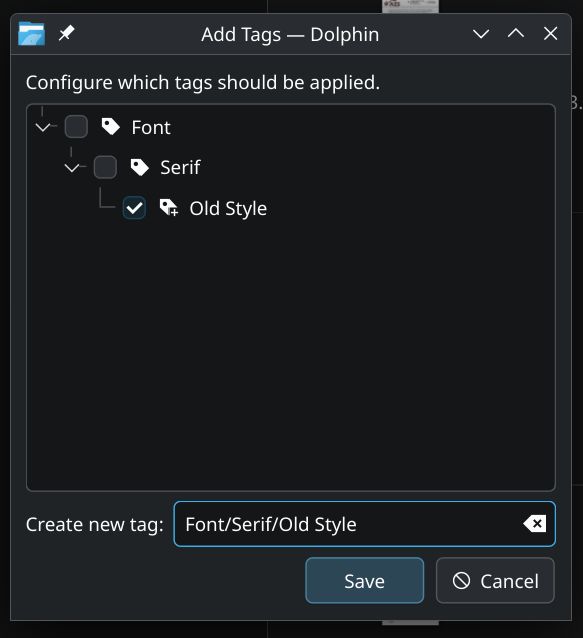 I tried applying tags to files in Dolphin, and as I did, I noticed I could add nested ones. However, the GUI is kind of buggy. For example, at first, I added Fonts/Feeling/Sincere, and it worked. Then I tried adding Fonts/Serif/Old Style, but as I started writing “Serif”, the “Feeling” tag disappeared. When I tried to force it to work, it started behaving very weirdly, eg, while exploring tags it showed me a parent folder of a tagged folder in a parent of the nested tag. I am not really sure if the fact that you can create a nested tag is an intended feature, or something that just happened because of GUI integration, or something like that?