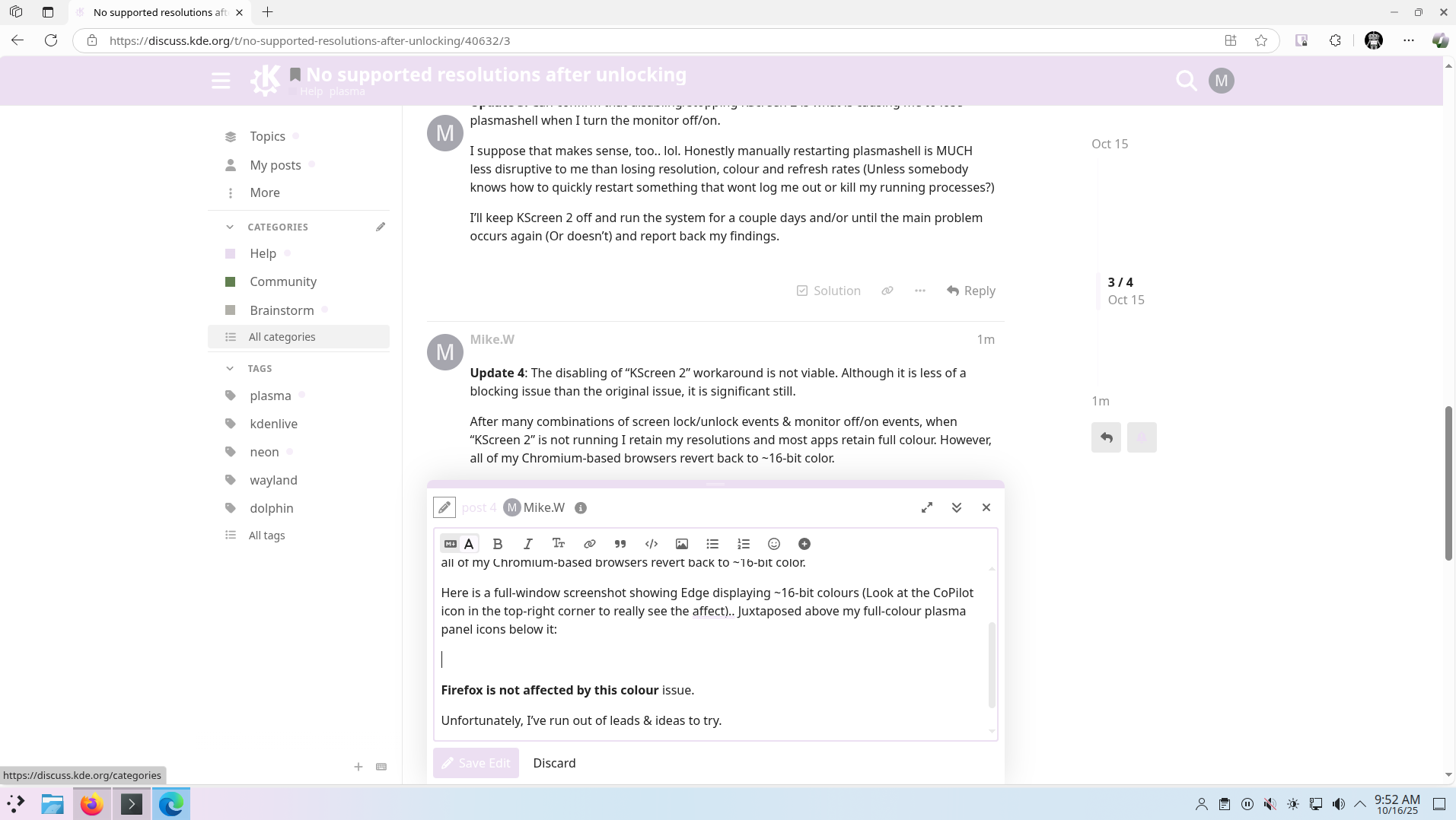 I’ll keep KScreen 2 off and run the system for a couple days and/or until the main problem occurs again (Or doesn’t) and report back my findings.