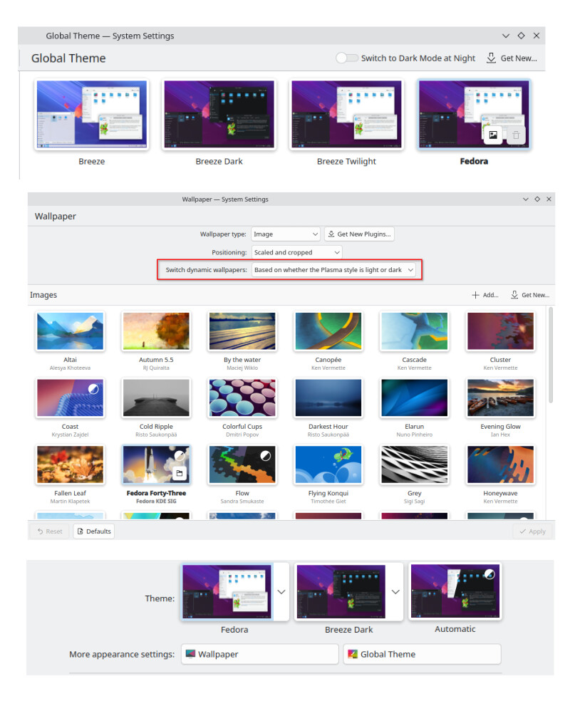 As you can see in the above pictures I am using the Fedora theme and you can see the dynamic wallpapers configuration. Also night light is enabled (I do not think it is related to that but might useful).