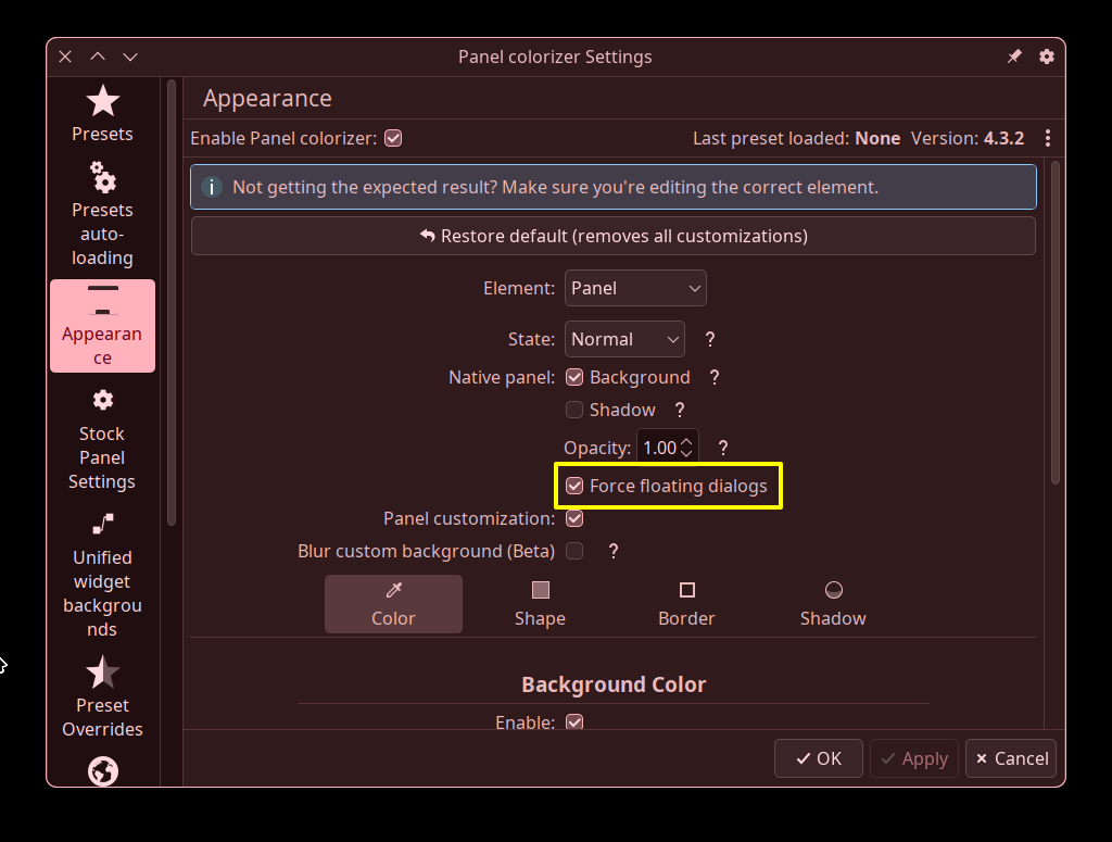 b) it bypasses Plasma’s theming system by displaying custom shapes/colors and since it is currently applied only for the panel it creates inconsistency with everything else in Plasma that will still use the Plasma Style/Colorscheme