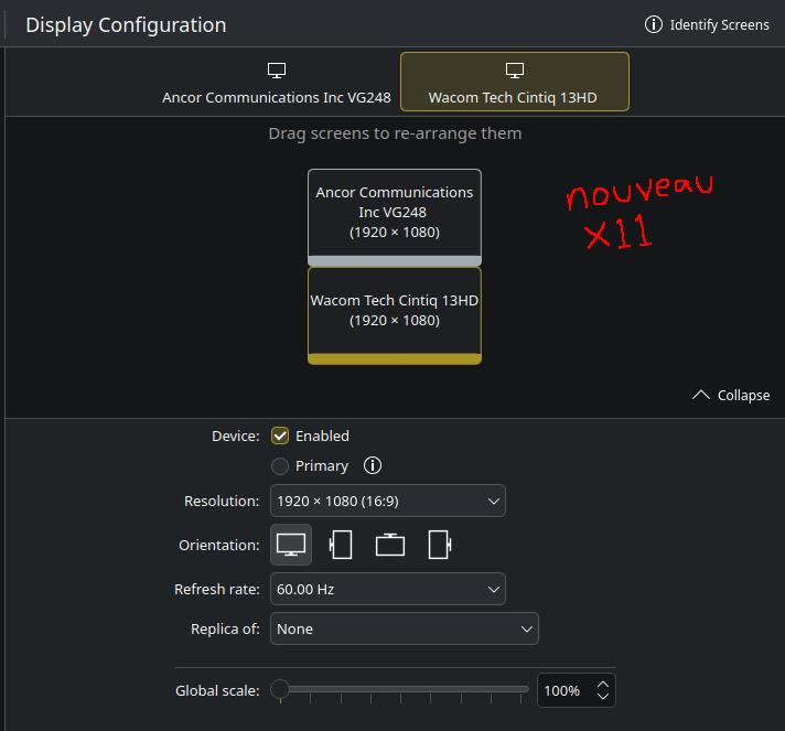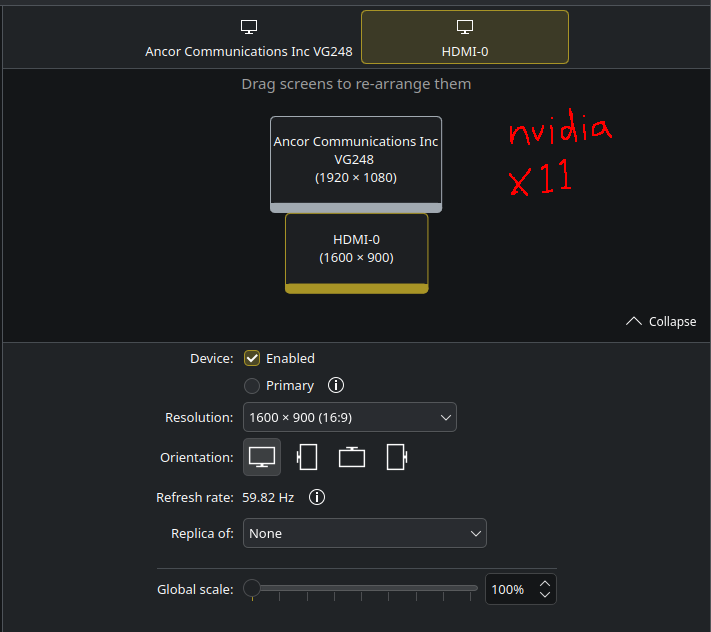 Hello! I’ve been running fedora 42 kde plasma on my main PC with the RPM nvidia drivers and it’s been fine until today when I woke my pc up from sleep mode. Usually sleep mode has no issues but today my second monitor (Cintiq 13HD) didn’t turn on after waking. After I turned it on, the resolution was set to 1024x768 at a stretched aspect ratio instead of the usual 1080p. I can’t set it back to 1080p or 16:9 and features like DDC/CI brightness control stopped working. Also the name shows up as HDMI-A-1-unknown instead of the usual Cintiq 13HD (or whatever it showed up as before). My main monitor still works fine.