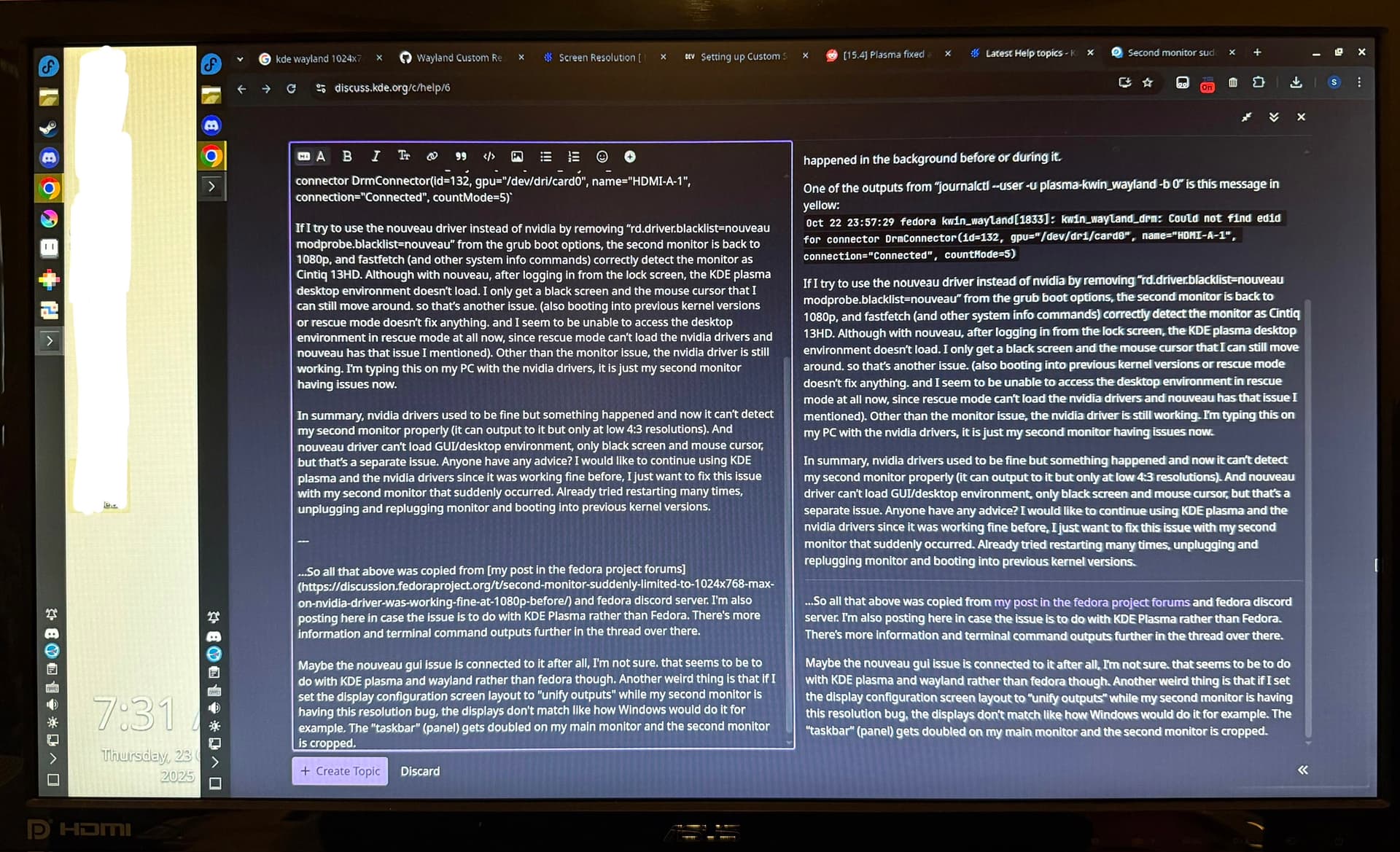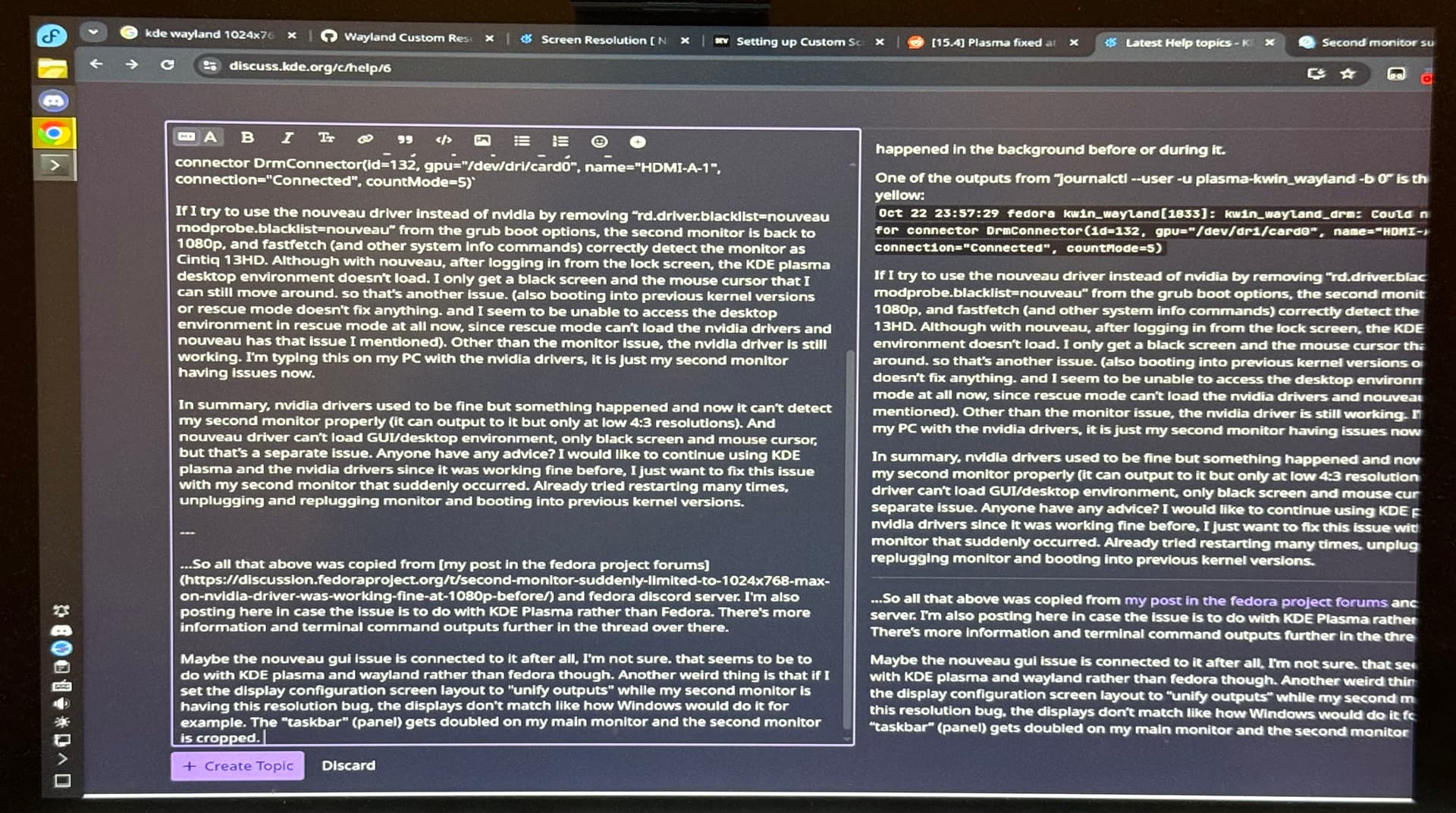 Maybe the nouveau gui issue is connected to it after all, I’m not sure. But it might be to do with KDE plasma or wayland rather than fedora. Another weird thing is that if I set the display configuration screen layout to “unify outputs” (second monitor replica of main) while my second monitor is having this resolution bug, the displays don’t quite match like how Windows would do it for example. The “taskbar” (panel) gets doubled on my main monitor and the second monitor is cropped, with maximized windows cut off on the right. I assume it’s because the second monitor is outputting a 4:3 resolution (stretched to 16:9), so everything outside is cropped instead of being scaled down to fit. It’s kinda hard to describe so I’ve attached a photo of the main monitor and second monitor respectively.