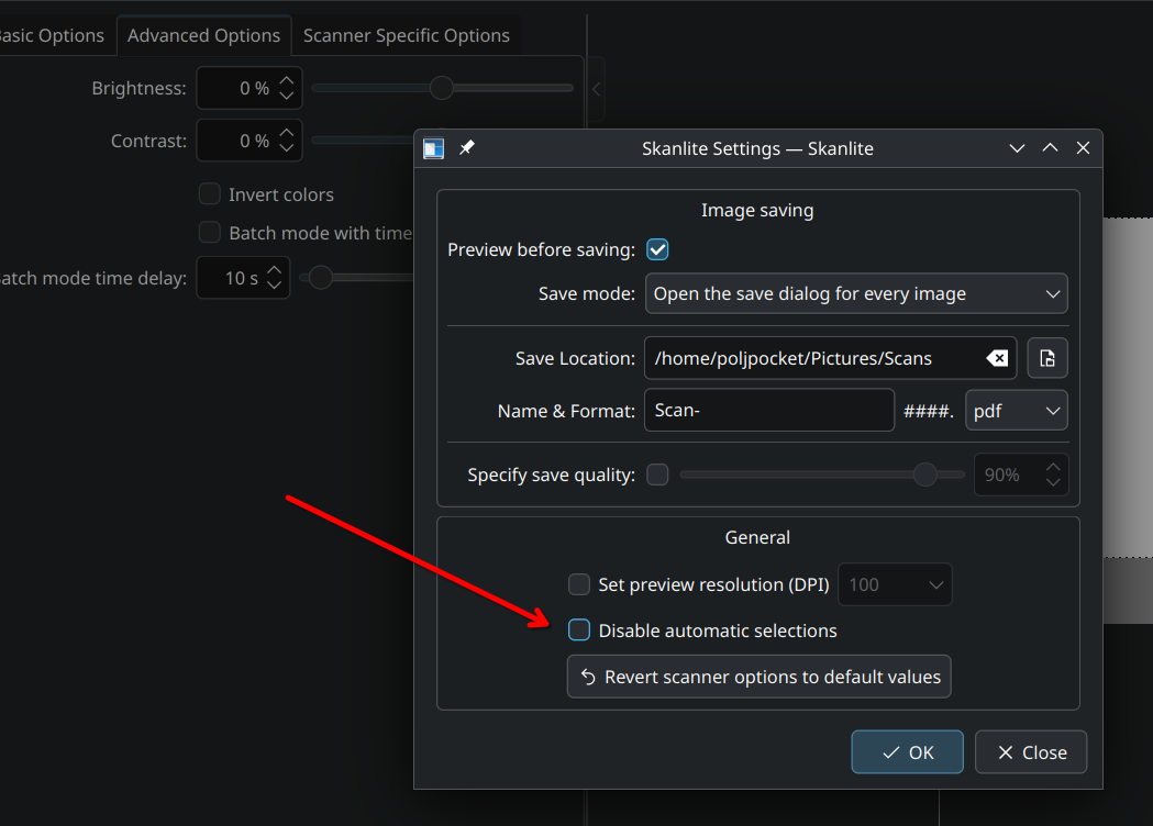 HOw do I prevent Skanlite from changing the scan area I have set in Basis options (A4) After a preview it selects areas where is content. Can I disable that?