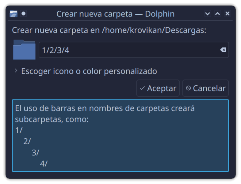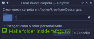 You enter 1 to call the new folder and click in the checkbox for tell Dolphin that the folder 1 goes into the folder in focus (or selected). I hope it is understandable my proposal.