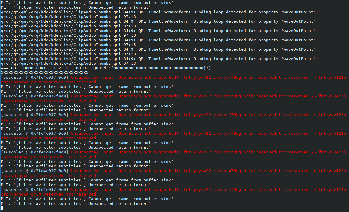 [swscaler @ 0x7fdc341d3340] Unsupported input (Operation not supported): fmt:yuyv422 csp:bt709 prim:reserved trc:reserved → fmt:yuv422p csp:unknown prim:reserved trc:reserved [filter avfilter.subtitles] Cannot get frame from buffer sink [filter avfilter.subtitles] Unexpected return format
