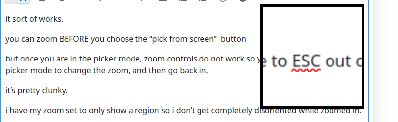 but once you are in the picker mode, zoom controls do not work so you have to ESC out of picker mode to change the zoom, and then go back in.