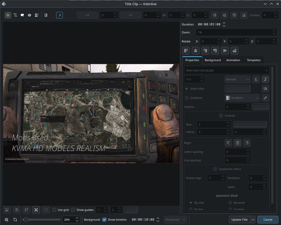 If I set title zoom to 0%, I won’t see text in neither timeline, clip preview nor render preview. I also have black background in the clip preview, even with 0% zoom, so not sure how you got the “see through” checkerboard.