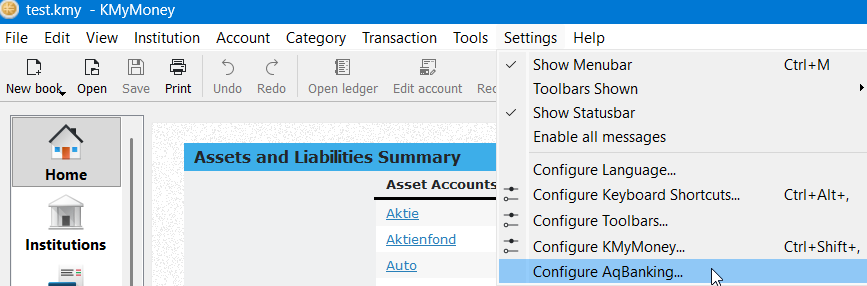 kmymoney.exefile and save it in the taskbar / the desktop to get a handy access later. - After the successful installation, you cant test if the AqBanking plugin works for your bank: