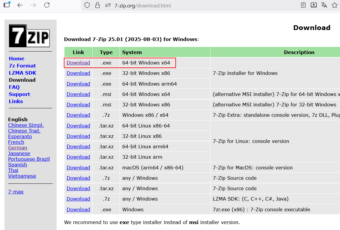 - Download 7-zip from this website: Download and choose the file corresponding to your architecture (64bit in my case)