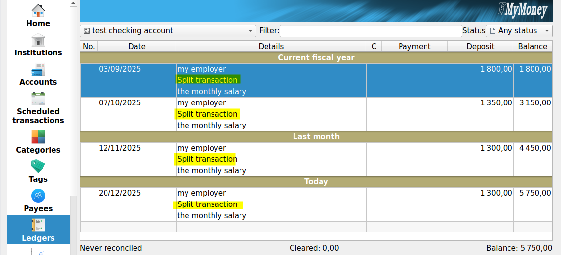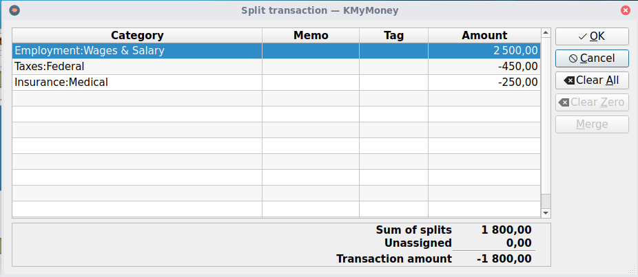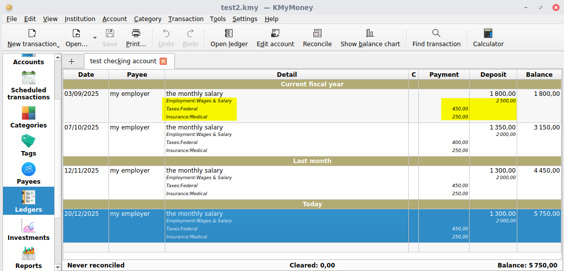 I use split transactions for the salary (to build the gross salary and track all expenses happening between gross and net salary).